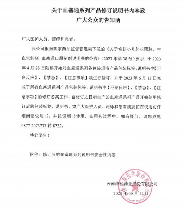 關(guān)于血塞通系列產(chǎn)品修訂說明書內(nèi)容致廣大公眾的告知函