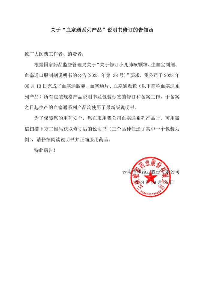 關(guān)于“血塞通系列產(chǎn)品”說(shuō)明書(shū)修訂的告知函